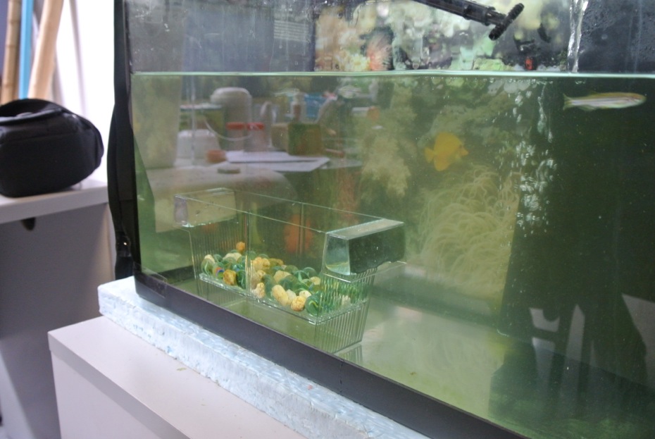 Para iso puxemos dúas femias e un macho na parideira, compartimento especial onde os ovos, unha vez postos, se filtran ao fondo para que os proxenitores non os coman. Tras varios intentos non funcionou, co que redobramos esforzos e tapamos o acuario de noite para que os peixes se excitasen coa luz do día, o cal tamén foi en van. Incluso trouxemos outro acuario, pero pese a todos os nosos esforzos nos resultou imposible lograr descendencia.